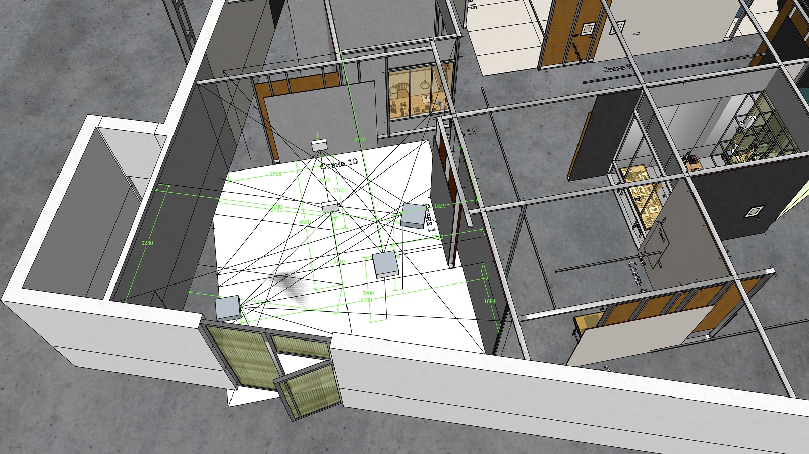 В инсталляции использовано оборудование, которым уже располагал музей: пять мультимедийных проекторов и сервер WATCHPAX 40 с четырьмя выходами и предустановленным ПО Dataton WATCHOUT. Наши инженеры спроектировали систему для проекции на пол и на три стены, две из которых были разноуровневыми.