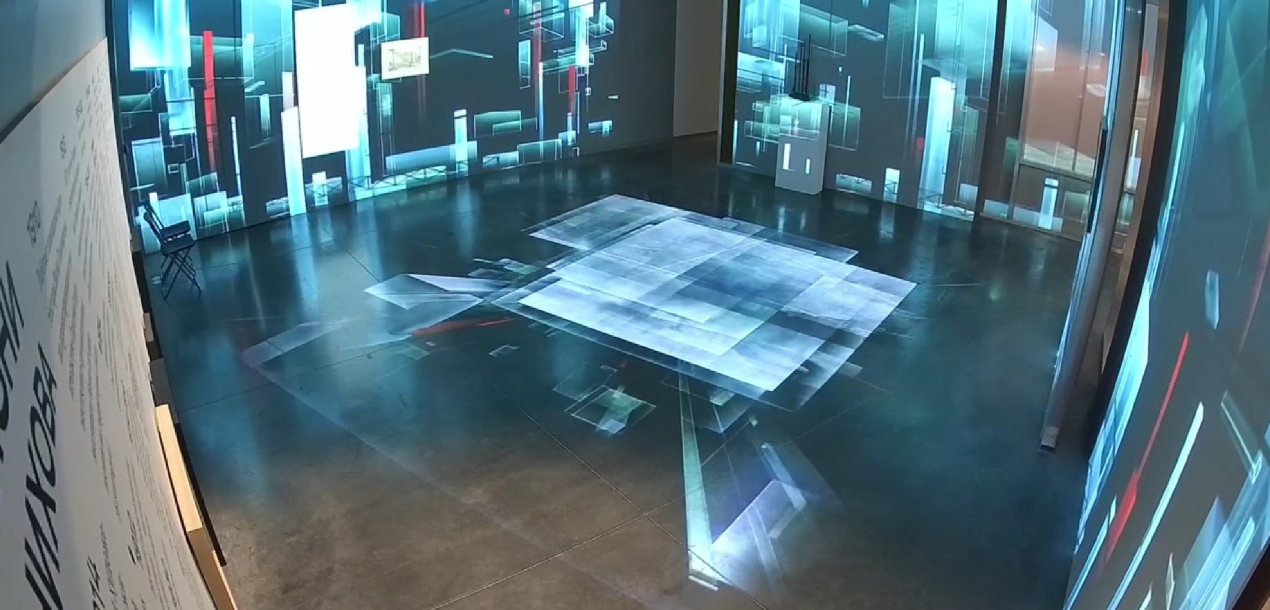 Мы спроектировали, выполнили настройку и разработали контент для инсталляции “Погружение”, встречающей посетителей в первом зале выставки. Анимация и саундтрек настраивают гостей на восприятие футуристических идей великого экспериментатора.