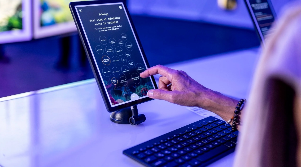 Посетители с помощью планшета создают свой «мир мечты»: для этого ИИ генерирует серию тщательно продуманных подсказок. Участникам задают вопросы о желаемом ландшафте, атмосферных условиях и технологических решениях.