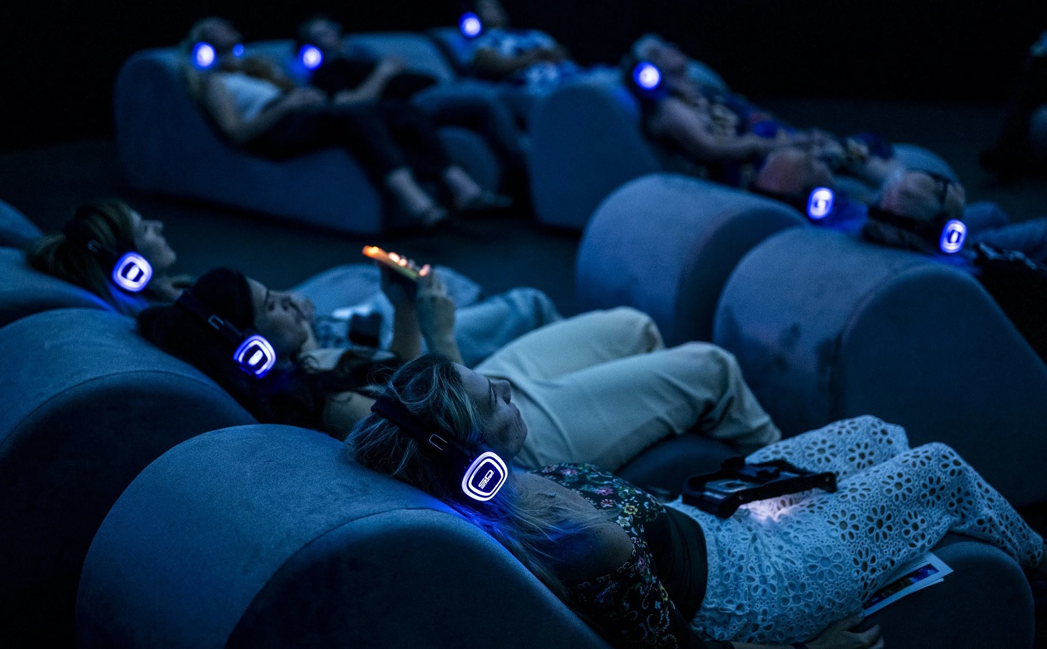 В шатре «Погружение» посетители сидят в откидывающихся креслах, наблюдая красочное видео на куполе и слушая рассказ ведущего. Контент был специально разработан для преобразующего, медитативного воздействия, призванного противостоять фобиям, связанным с климатом.