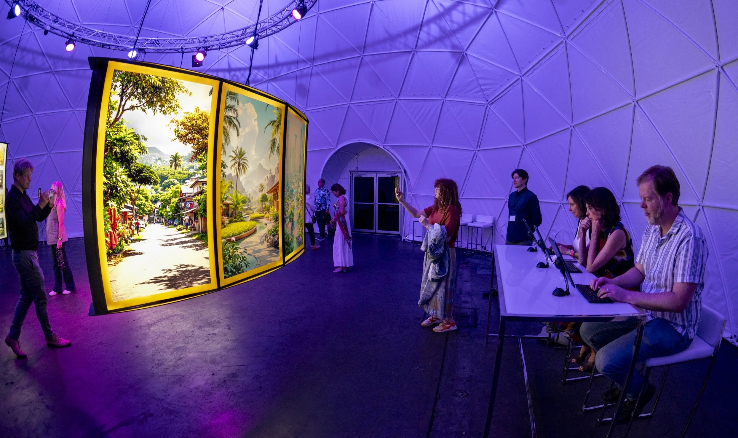 Затем посетители снимают наушники и входят в шатёр «Сотворение». Здесь на экранах отображаются миры, придуманные посетителями с помощью ИИ: платформа искусственного интеллекта разработана специально для Lumisphere Experience.