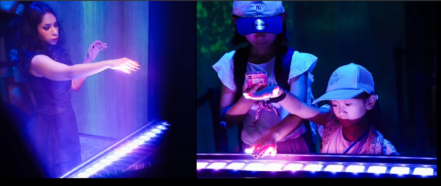 Серия вертикальных световых лучей создавала виртуальную арфу, а за каждым лучом располагались лидарные датчики, которые запускали звуковые и световые эффекты при обнаружении взаимодействия.
