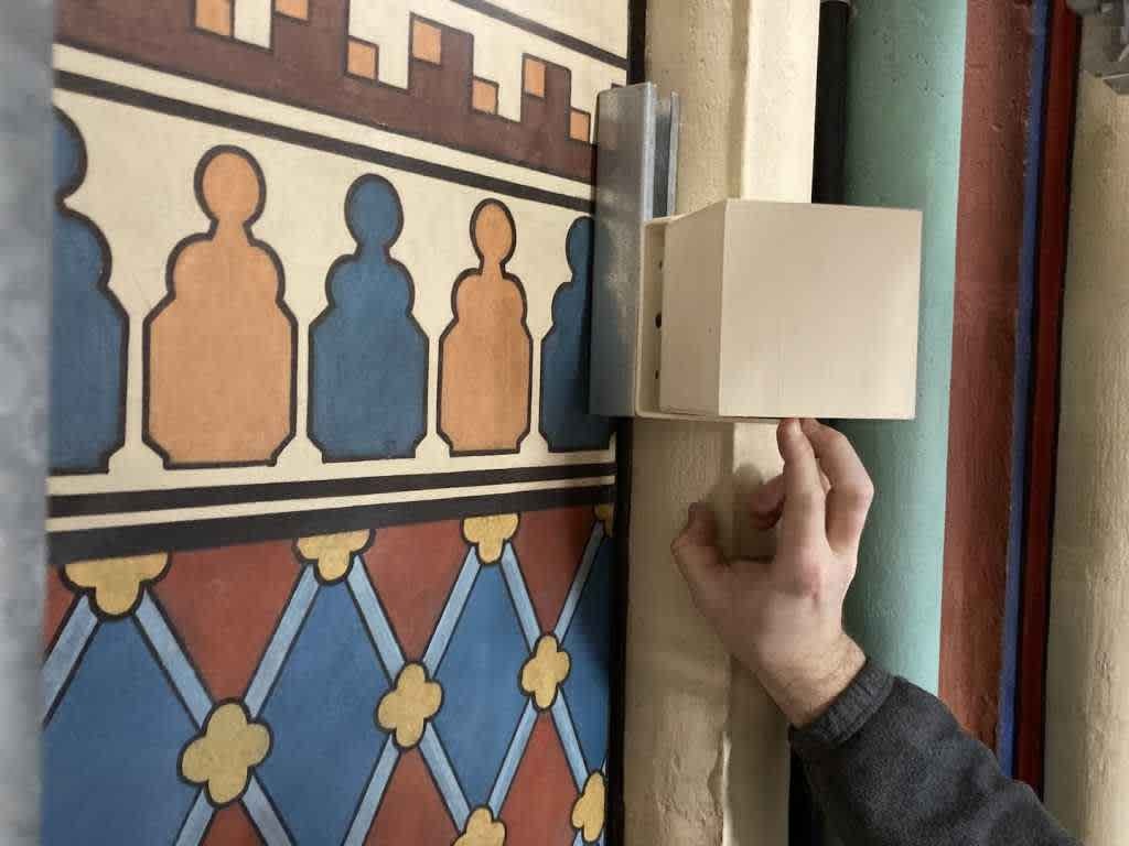 Для громкоговорителей, расположенных над капителями колонн, были изготовлены на заказ металлические конструкции, позволяющие устанавливать устройства на камень, а кабели незаметно проложили в растворных швах колонн.