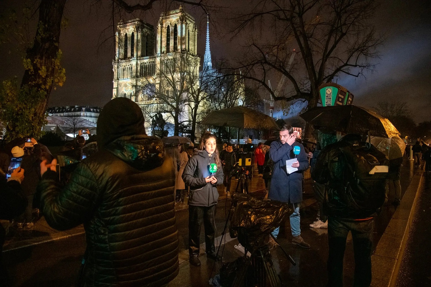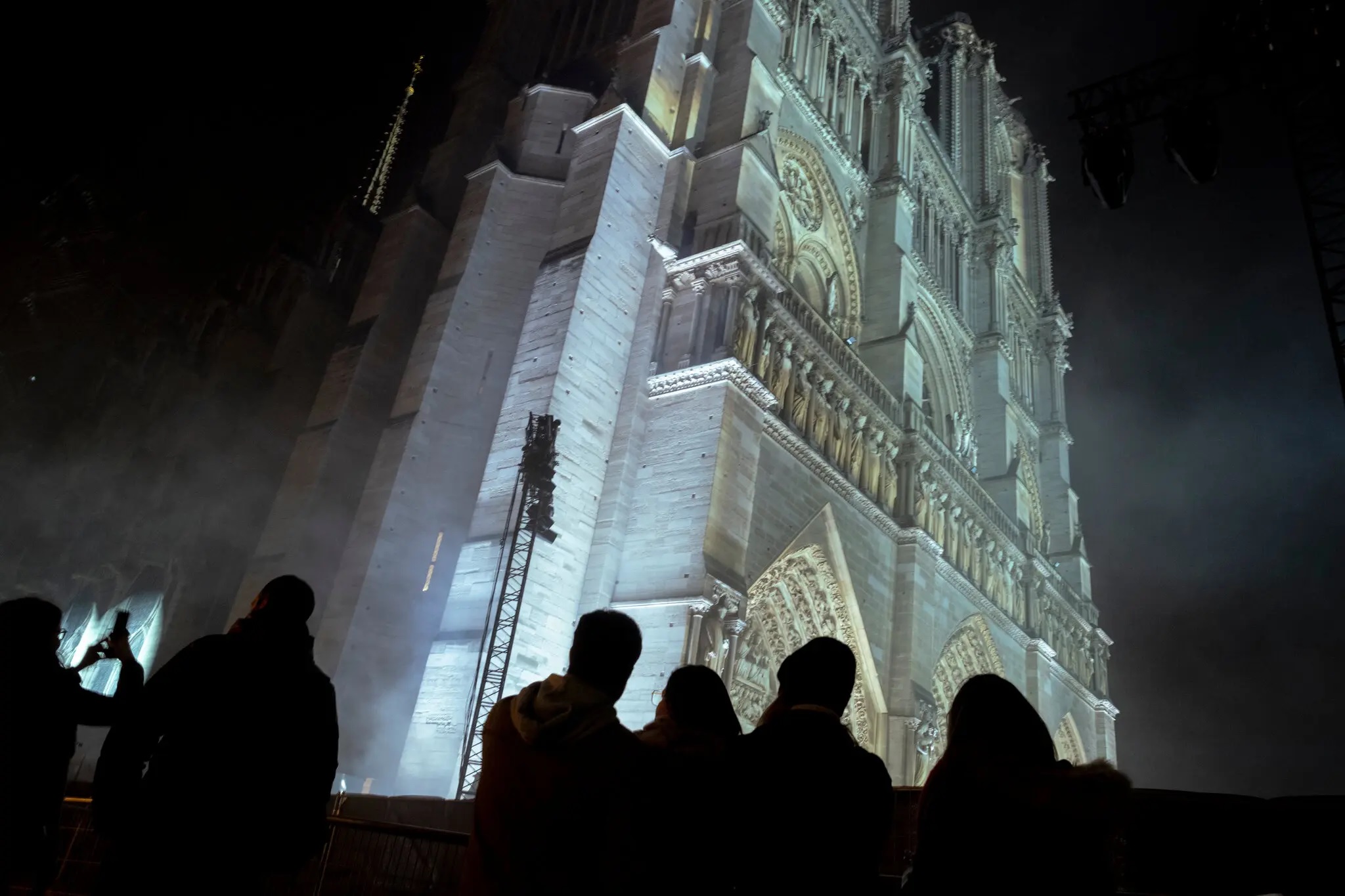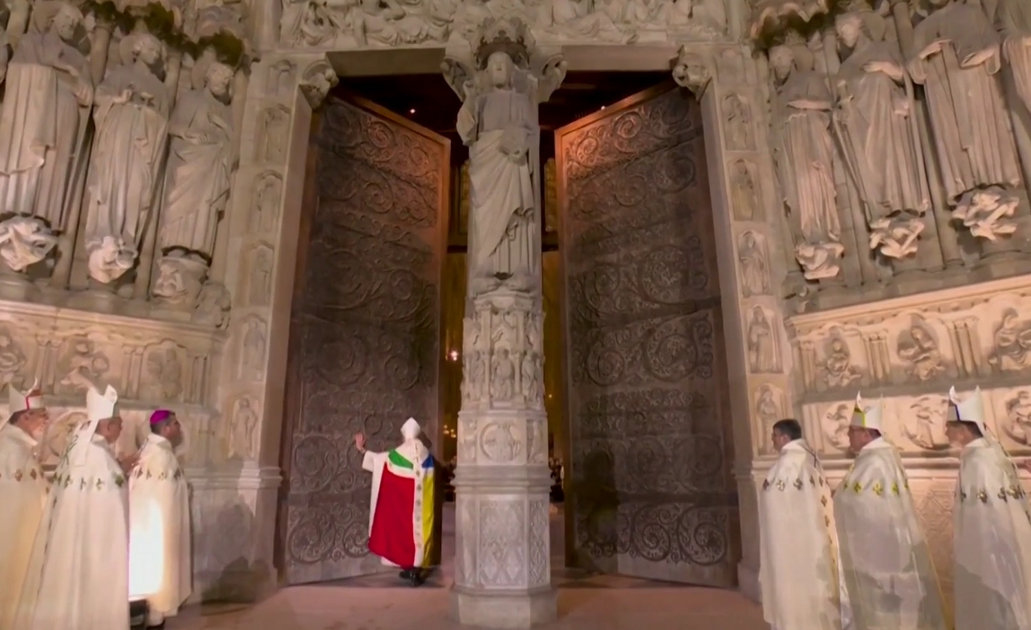 И вот впервые за пять лет зазвонили колокола собора. Архиепископ Парижа трижды ударил посохом в двери собора; каждый удар запускал подсветку фасада. Хор ответил изнутри, и когда двери открылись, президент Франции вошел в неф, чтобы присоединиться к собравшимся.